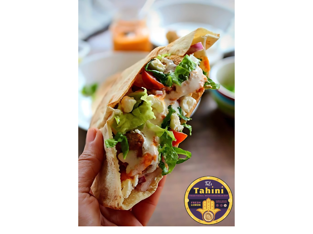 - Spread Tal’s Tahini Fresh Lemon in the center of the pita.