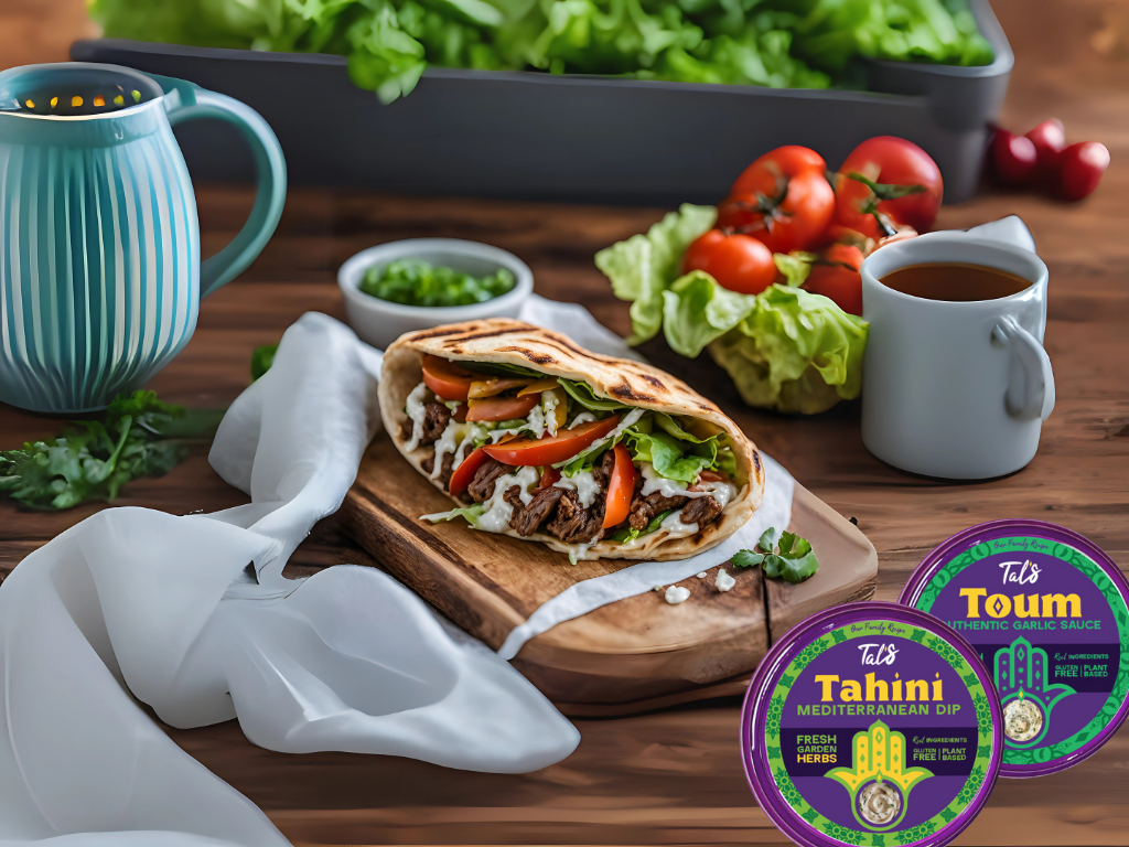 - Spread a layer of Tal's Toum inside each pita. Fill with lamb, mixed greens, tomatoes, and mint leaves.